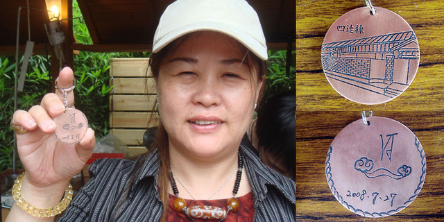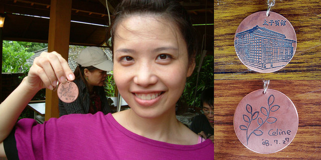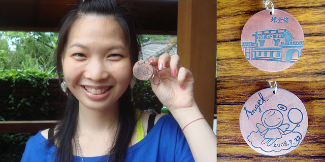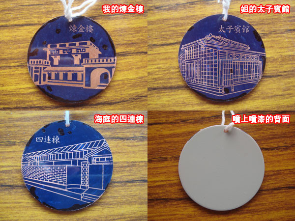 正面-茱蒂老師先將四種特色建築圖案用雷射印表機印在PNP上..用熨斗與紅銅片貼合