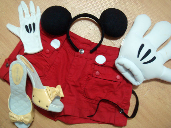 2.剪兩塊白色圓型不織布..縫在紅色短褲兩旁..在後面貼上細長的尾巴..白色手套上黏上三條線