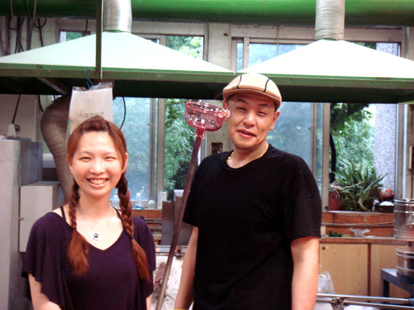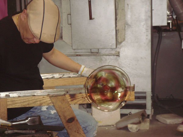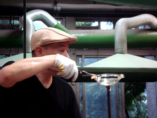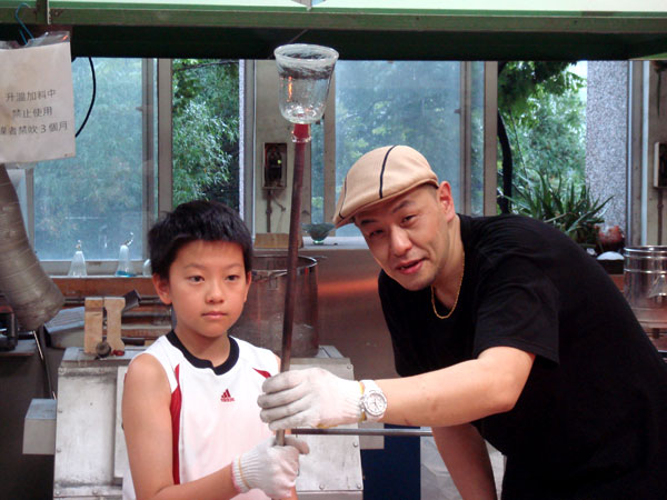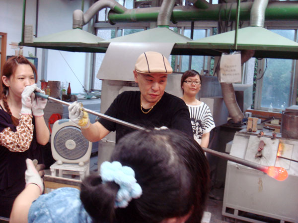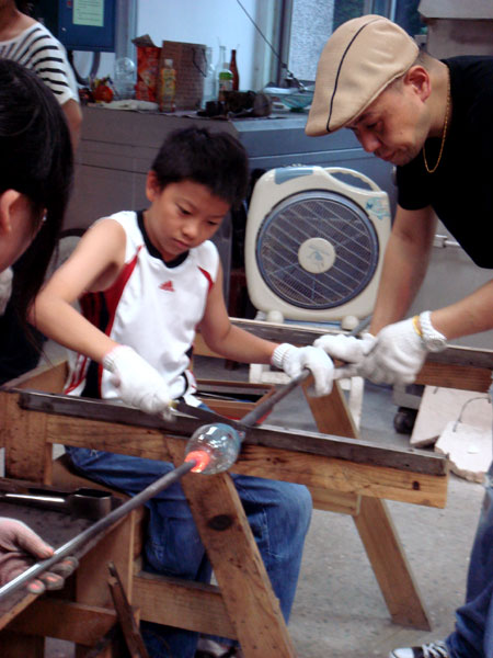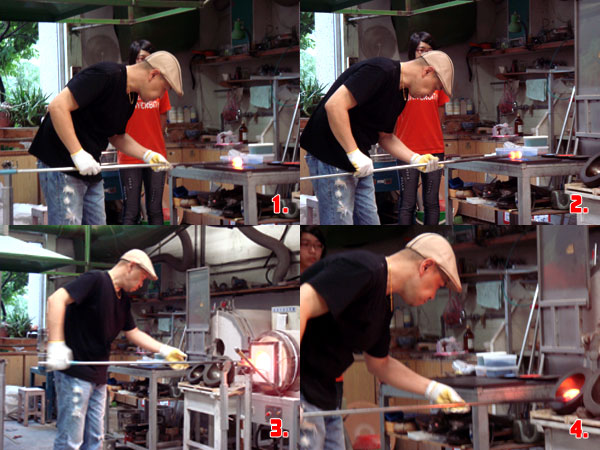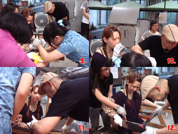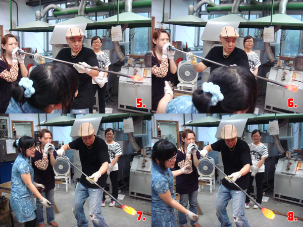等都吹好差不多的大小..安井老師會再用一些玻璃液..再請我吹