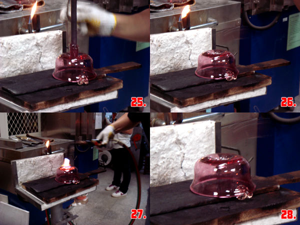 再吹將形狀固定..安井老師再進爐子裡讓玻璃受熱..再用木板..壓瓶底